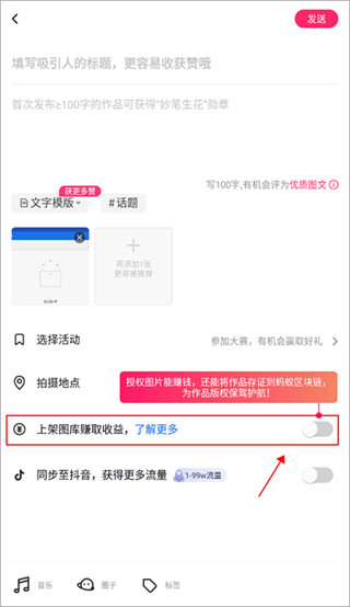 1、点击软件中央加号图标打开内容发布页面,在图片下方有一个【授权图库换收益】,只有将这个功能打开才能进行获取收益。
