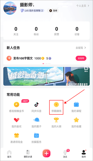 1、进到图虫app,在我的界面的常用功能版块,选择“供稿赚钱”。