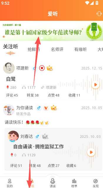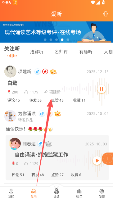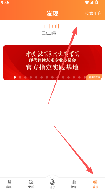 6、发现,了解更多内容,搜索你喜欢的诵读者关注,在这里可执行操作。