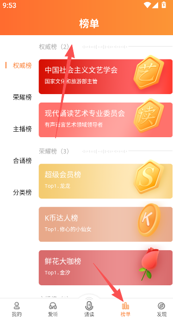 5、榜单,为不知道想要听什么的用户提供最权威的榜单,筛选自己感兴趣类泪目点击诵读收听就行。