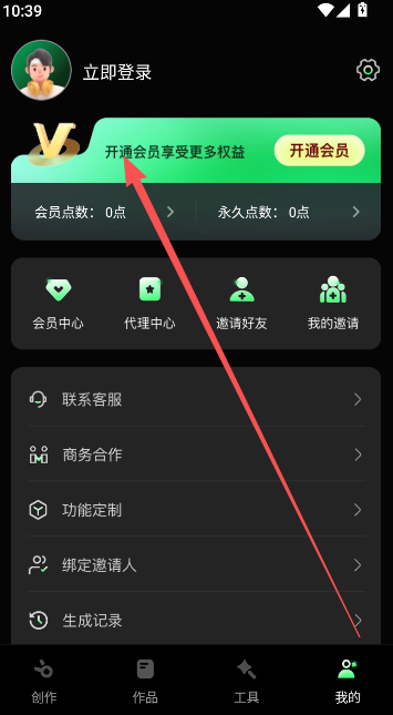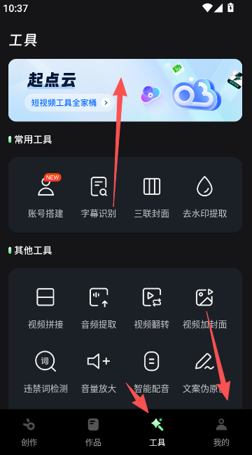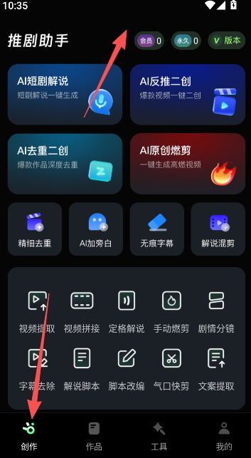 1、免注册登录进入推剧助手,为大家提供创作、作品、工具以及我的等版块。