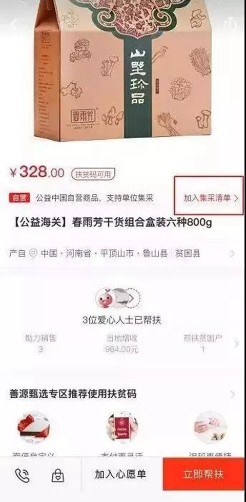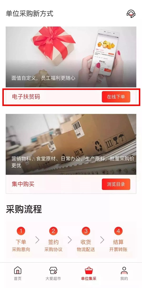 集中购买批量购买扶贫产品。将商品加入集采清单→确认收货→开具明细发票→对公付款。