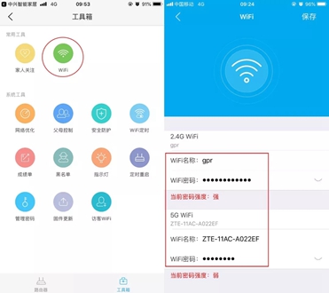 点击右侧按钮【工具箱】你将看到中兴路由的强大功能!WiFi设置点击【wifi】按钮可以直接修改wifi名称及密码对于不会连路由的妹纸简单明了的设置简直是福音!