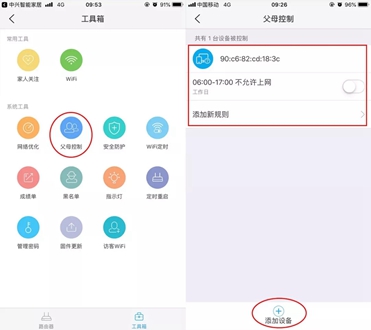 打开【家长控制】按钮可以对指定设备设置断网时间比如对【测试】的设备需要进行定时监管在界面添加该设备然后设置上网时间为6点-17点那么在这个时间范围内该设备将继续连接WiFi但无法访问internet断网断的悄无声息~~