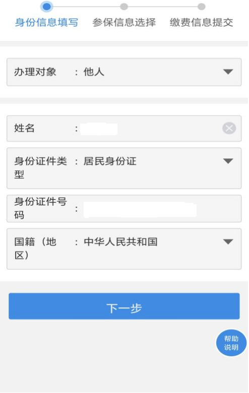2、点击【自然人业务】-【社保缴费办理】-【灵活就业人员正常缴费(当年当月及以后)】进入模块功能,选择“本人”或“他人”,填写“姓名”、“身份证件号码”等身份信息,点击“下一步”。