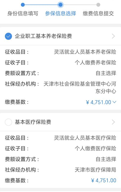 3、页面跳转到【参保信息选择】页面,系统展示缴费人的参保信息,分别选择“企业职工基本养老保险费”或者“基本医疗保险费”(养老保险和医疗保险无法一次全部勾选完成缴费,需分两次缴款),点击“缴费基数”可以设置指定生效年月的缴费基数额度。点击“下一步”。