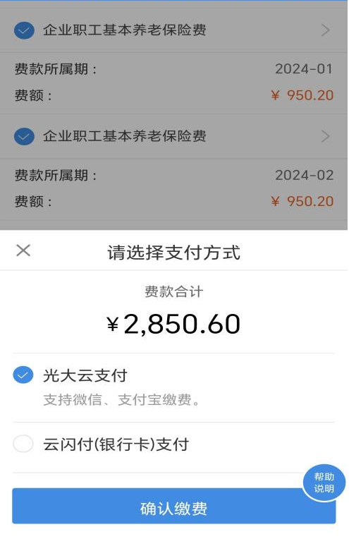 4、页面跳转到【缴费信息提交】页面,页面自动带出对应的待缴费数据。可按月选择待缴费数据,点击【提交】按钮跳转到【选择支付方式】页面,选择自己需要使用的支付方式,点击【确认缴费】,根据支付操作提示完成支付。