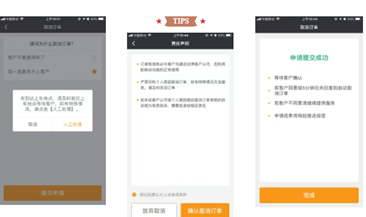 根据实际情况选择后,满足取消条件系统会给客户发送确认取消短信,如客户在5分钟内未回复短信,或短信回复同意取消,系统立即取消订单。如未满足系统自动取消条件,会出现【人工处理】按钮,可以根据实际情况填写,会有人工客服及时处理。