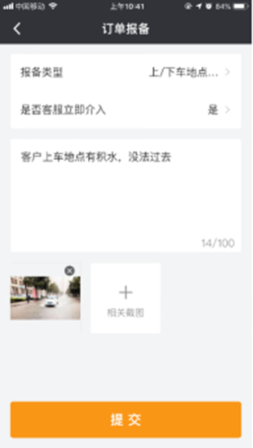 3)订单报备:订单待服务/已出发/已到达/开始服务/已取消状态,可通过订单详情页提交报备信息,填写内容尽可能详细,如有紧急情况需人工处理,“是否客服立即介入”选择“是”。订单结束服务后如需报备,可通过司机端个人中心【联系客服】模块反馈。