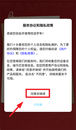 打开坦途学车学员端app,在服务协议和隐私政策提示界面点击同意并继续