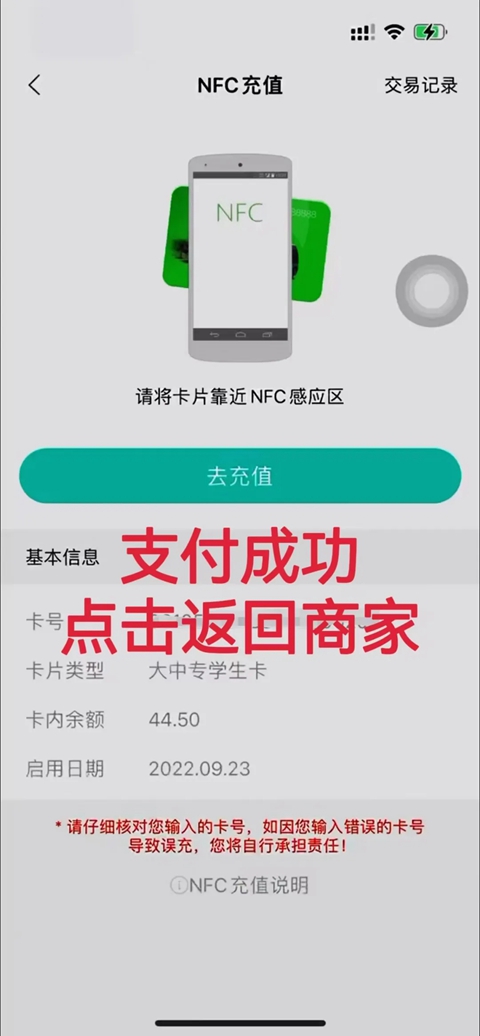 等待充值完成:支付成功后,不要立刻移开公交卡,稍等片刻,APP会显示充值进度,当提示“充值成功”时,就可以拿走公交卡啦。【如提示您有一笔未完成订单或充值遇到异常,请重新放卡充值或到网点处理,只需再次读卡,系统提示充值成功,公交卡余额增加完成自助充值操作。
