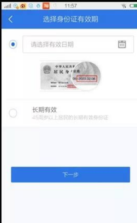3、填写身份证有效期:45岁以下的按照身份证背面有效期填写;45岁以上者可直接选择长期有效。