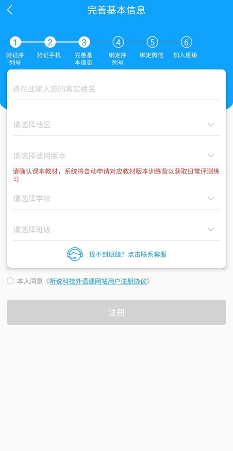 根据要求完善基本信息,填写姓名、地区、学校和班级信息后点击注册