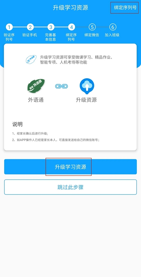 进入绑定序列号界面;如无可用的序列号,则可点击“跳过此步骤”,进入下一步骤。如有序列号,用户输入有效序列号进行验证,验证通过后可选择序列号对应的教材进行绑定。也可点击升级学习资源,选择购买相应的学习内容。绑定序列号后进入下一步骤