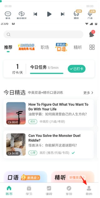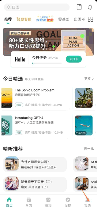 首先我们先进入到扇贝听力口语app当中,然后找到并点击底部的【我的】。