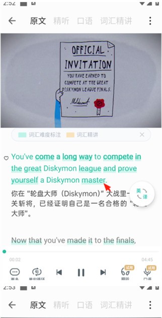 3、音视频课程均配有中英同步课文,你还可以根据需要任意切换单语、双语和无课文模式。