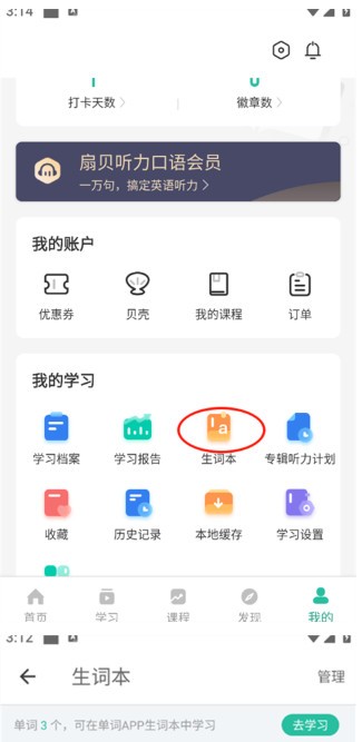 4、点击“我的学习板块”的“生词本”,这样就可以看到添加的生词了。