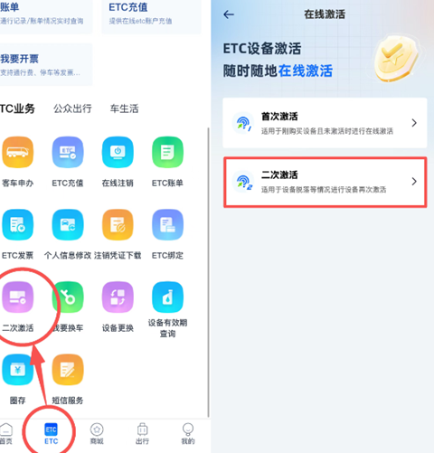 无卡ETC可手机激活或前往网点激活点击此处进入“渝智行”APP→点击“ETC→二次激活”功能,按步骤操作即可。