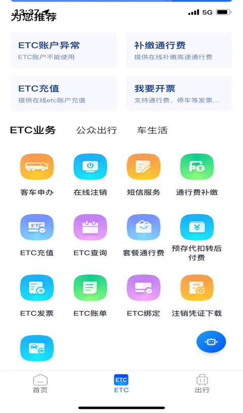 伴随式高速路径规划、导航、救援、路况提醒;一站式ETC办理、充值、发票、消费记录、注销;城市车生活养车、停车、加油、旅游、会员。