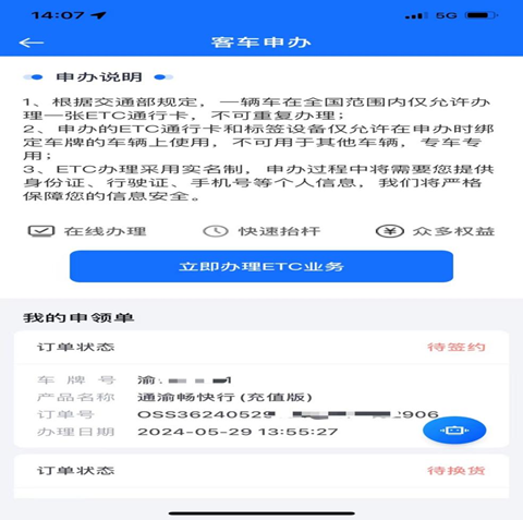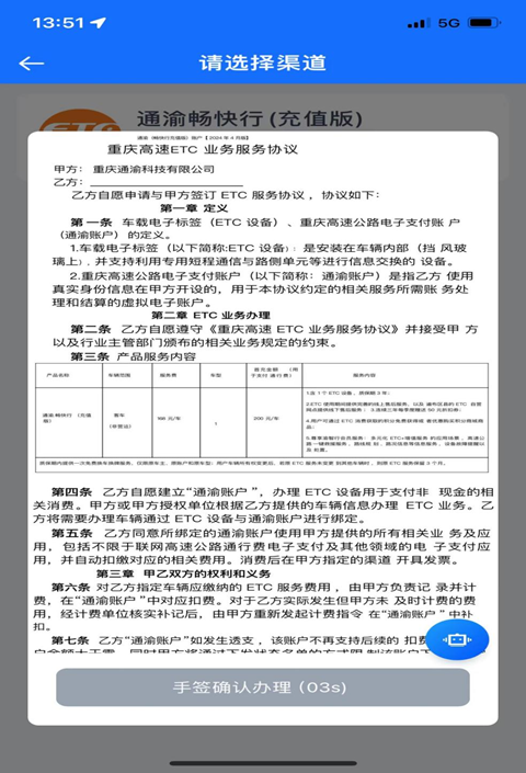 2:点击客车申办“立即办理”校验车牌,阅读并签署《重庆高速ETC业务服务协议》。