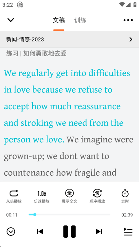 2、进入播放页面,下方支持从头播放、倍速播放、展示全文/单词、顺序播放以及定时等功能;