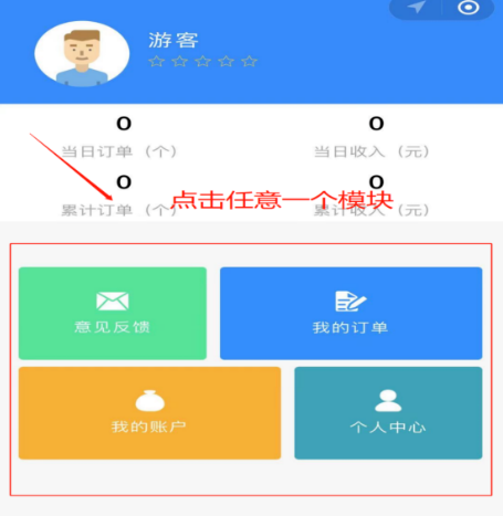 1、点击意见反馈、我的订单、我的账户、个人中心四个模块的任意一个模块,进入注册微信小程序页面