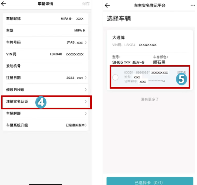 点击【注销实名认证】,选择需要解绑的车辆