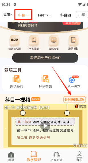 1、打开软件,注册登录好之后,选择科目一,在视频右上方点击认证