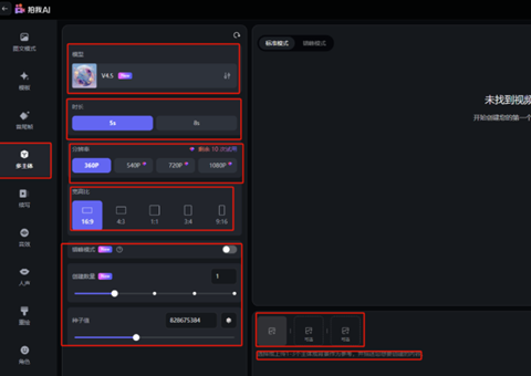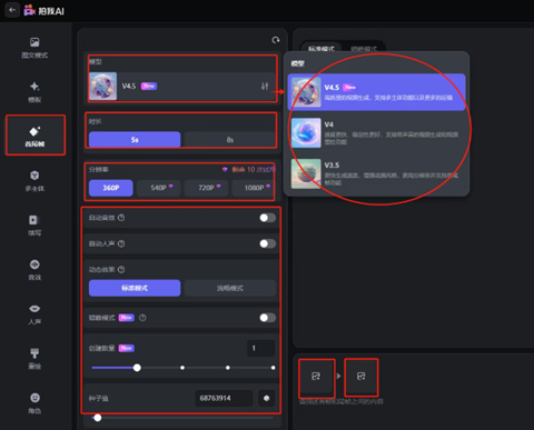 1.选择模型V4.5、时长、分辨率、宽高比、创建数量、种子值。