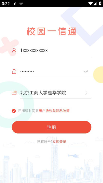 1.3输入注册的手机号 输入密码 选择所在学校等信息,便可注册成功。