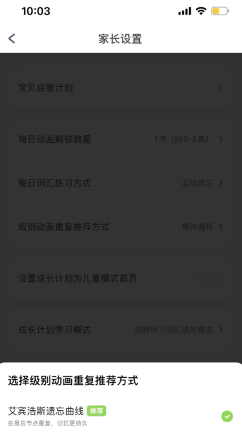 家长模式界面,对孩子每天的启蒙进度更加一目了然,还可以看到他每个月的启蒙报告、成长计划应该看的动画片等