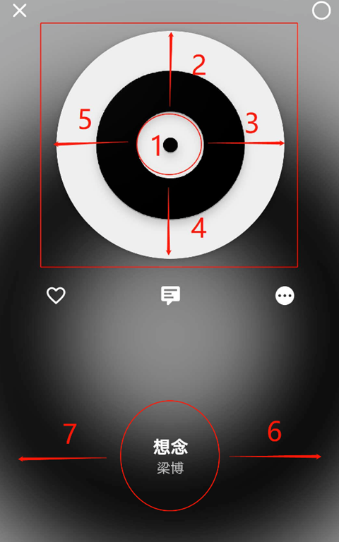 在红色区域内手指触摸并向右滑可打开歌曲详细。(包括收藏,评论,分享,克隆等等)