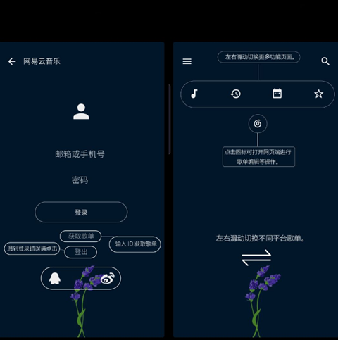 1、同时支持QQ音乐、网易云登陆及播放。(建议用QQ或手机号登陆获取歌单)