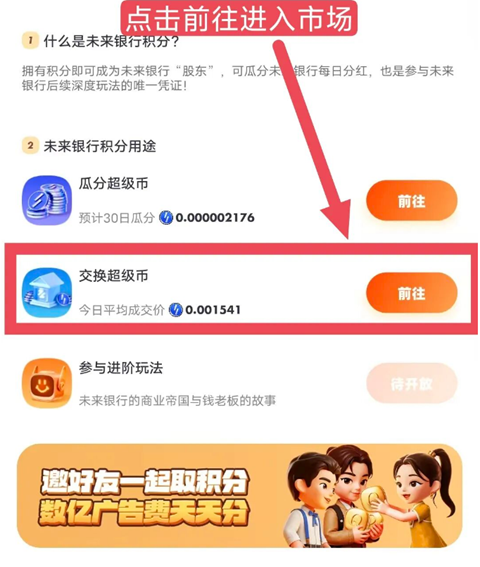 ② 完成“广告互动”积分任务,可将积分取至“我的未来银行”,此时可以进入市场将积分兑换为“超级币”