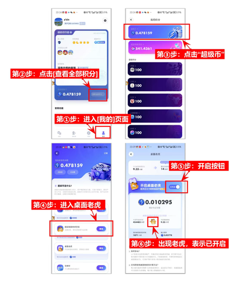 ③开启“桌面老虎”按钮:保持挂机状态,自动瓜分超级币(具体细则详见官方app说明)