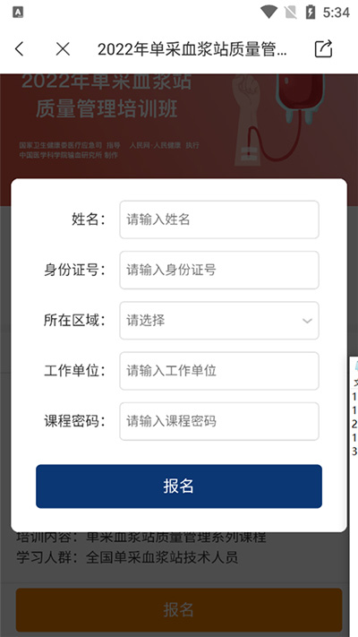 然后输入姓名、身份证、所属区域、工作单位、课程密码;