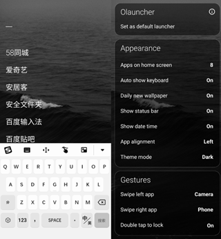 Olauncher整个界面极度简洁,主屏上的App只会显示名称,完全没有图标。可以设置暗和亮两种主题,其实就是白字和黑字的区别。如果打开了自动壁纸,它也会按主题下载对应色调的壁纸。