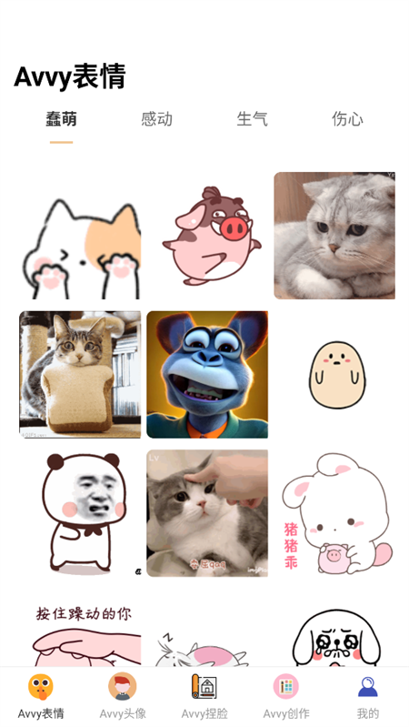 1、在Avvy表情界面下,我们能够获得各种类型的表情包,能够用于到一系列聊天互动过程中去。