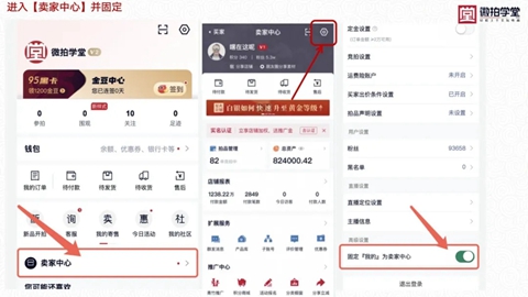 ——店铺需上品、发货、和用户沟通,无需额外下载商家版app,下载常规版【微拍堂】app,在【我的】-【卖家中心】进入即可。同时可在【卖家中心】右上角【设置】拉到底部,设置【固定我的为卖家中心】,便于后期店铺的运营维护。