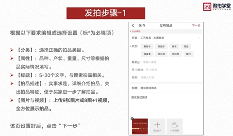 4、在发布拍品页面输入描述、标题并上传拍品图片/视频、设置分类等,点击右上角【下一步】直到完成发拍即可。