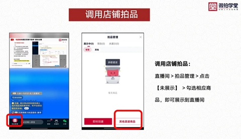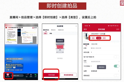 直播间发布/调用拍品——直播状态下,直播间左下角【拍品管理】-【即时创建/调用其他渠道商品】-设置相关信息即可在直播间透出