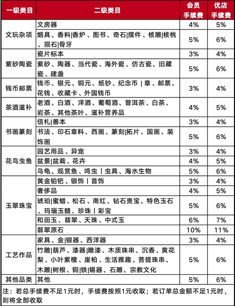 不同类目手续费不同,一般在3%-10%之间。例如,文玩杂项、紫砂陶瓷等类目手续费为3%-5%,翡翠原石等特殊类目手续费较高(10%)。手续费按订单金额比例收取,具体以平台规定为准。
