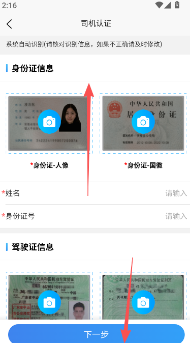 3、按照图示要求,完成姓名身份证号码的输入,上传身份证件以及驾驶证件等信息,完成认证。