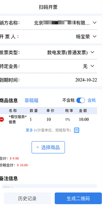 3、企业对商品信息和开票金额进行维护填写后,可以通过连接蓝牙打印机打印扫码小票或者通过短信,微信分享给消费者,消费者通过扫码,填写购方信息,即可成功进行开票。