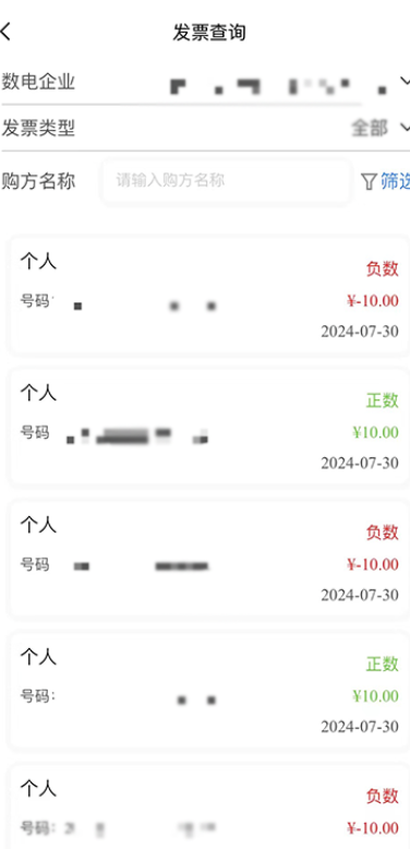 5、支持多企业发票明细查询,提供发票 pdf、ofd版式文件下载,同时支持复制开具、负数开具、二次推送、短信及二维码交付。