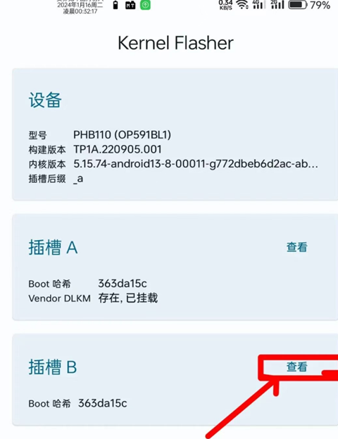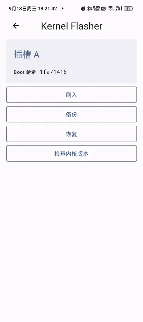 然后在Kernel Flasher点击未挂载的插槽A中的【查看】,如果你安装的是魔改过的Kernel Flasher可以看到【刷入】按钮