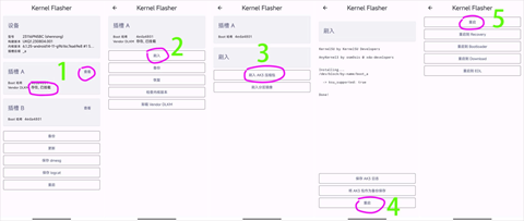 3、打开Kernel Flasher,按照如下步骤操作查看插槽(已挂载的)-刷入–刷入AK3压缩包–刷入成功(重启)-重启设备,然后即可成功刷入