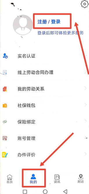 1、打开“云南人社12333”手机APP,进入登录页面,点击 “我的”右上角“注册”,进入注册页面。