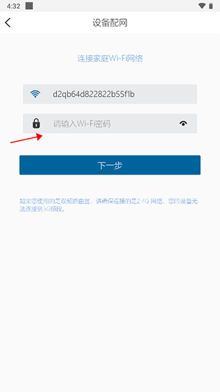 5、输入无线网络密码,选择下一步,不过大家需要注意如果您使用的是双频路由器,请确保连接的是2.4G网络,您的设备无法连接到5G频段。