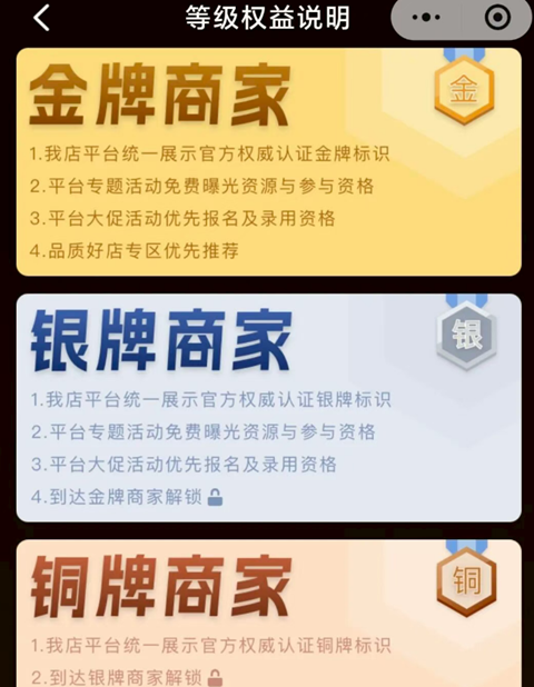 平台设有金牌、银牌、铜牌商家体系,不同等级对应不同权益与曝光支持,助力店铺获得更多流量与订单